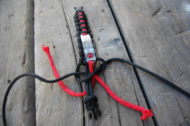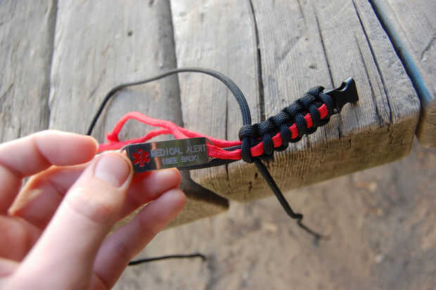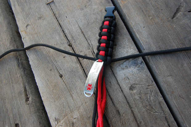 Al llegar a 1/3 de la pulsera completa, línea de la etiqueta para ver donde debe añadirse. Debe haber la misma cantidad de espacio en la pulsera a cada lado de la etiqueta cuando está conectado. Desea que la etiqueta para estar justo enfrente de la hebilla cuando se sujeta la pulsera.