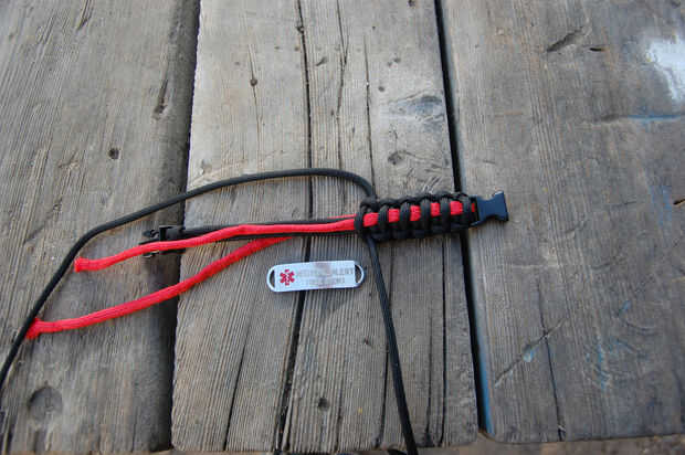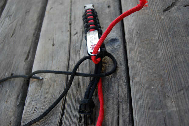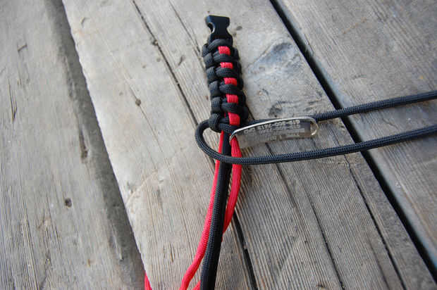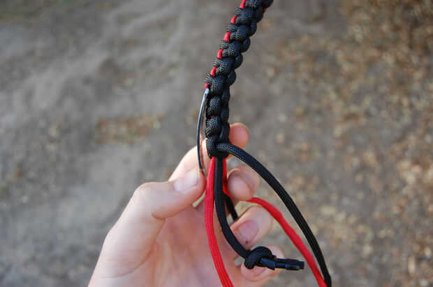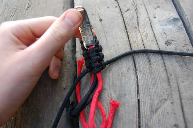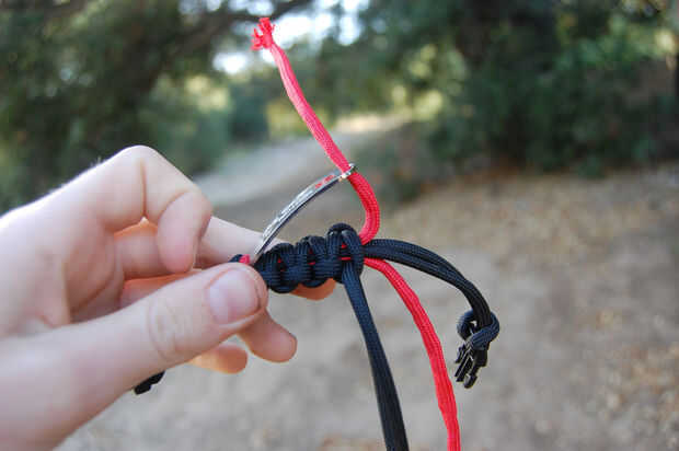 Cuando encuentres donde desee agregar la etiqueta, seguir el patrón que teje hasta llegar a ese lugar. Luego, enrosque el flatline a través de uno de los agujeros en la etiqueta. Tejer el patrón sobre el flatline para asegurarlo. De la armadura hacia abajo hasta llegar al punto donde se debe agregar el otro extremo de la etiqueta. Otra vez, el flatline a través del hilo de rosca, fijarlo y seguir el patrón de la armadura (flatline bajo flatline sobre), hasta llegar a la hebilla.