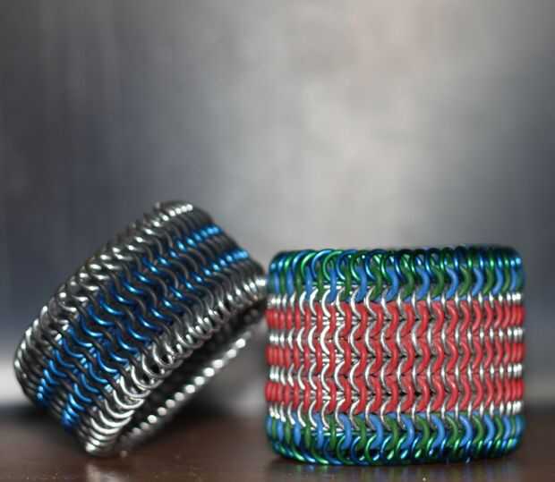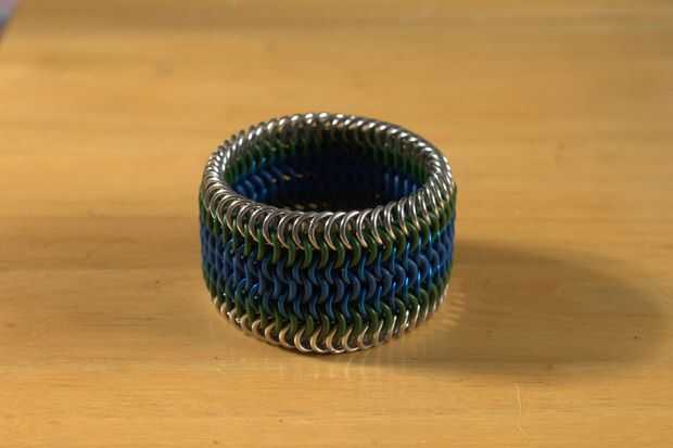 La pulsera puede ser tan estrecha o tan amplia como desee, siempre y cuando sea un múltiplo de la anchura del anillo. A continuación ver 2 7 wides (la plata, azul, negro; y la plata, azul y verde) y un ancho de 11.