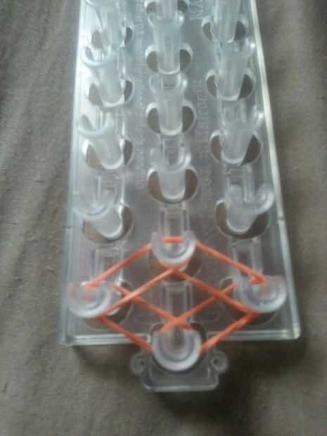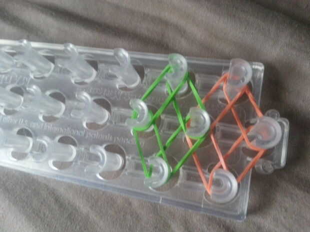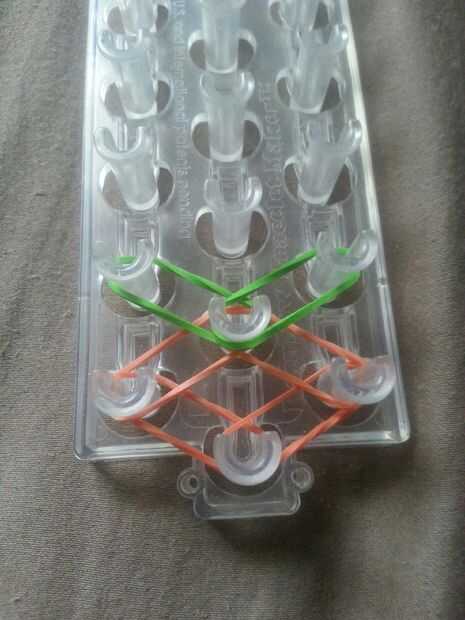 Paso 1: materiales 1 telar, 1 gancho, bandas y un broche. Asegúrese de que su telar tiene la flecha apuntando lejos de usted.Paso 2: patrón Poner una banda (primer color) abajo de la media a la izquierda. Entonces hacerlo a la derecha, izquierda dere