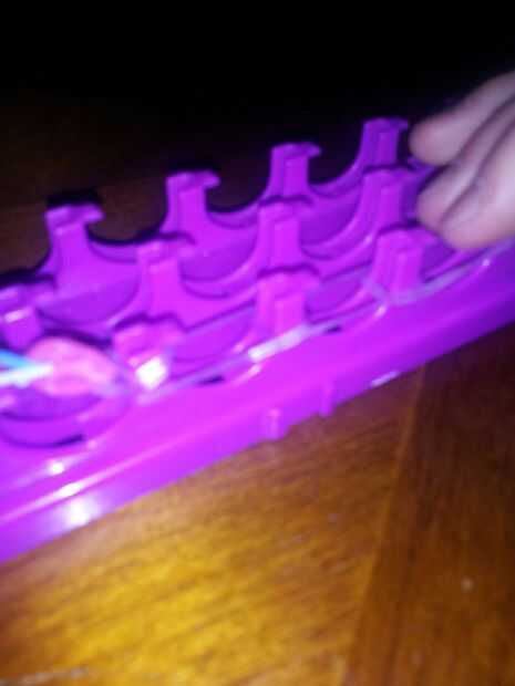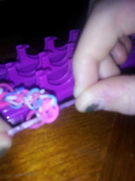 Paso 1: materiales 1 telar, 1 gancho, bandas y un broche. Asegúrese de que su telar tiene la flecha apuntando lejos de usted.Paso 2: patrón Poner una banda (primer color) abajo de la media a la izquierda. Entonces hacerlo a la derecha, izquierda dere