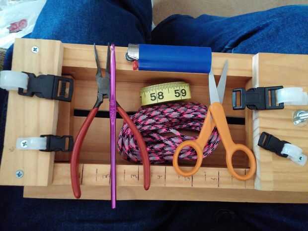 Paracord, medición de cinta, tijeras, fid/nariz alicates/ganchillo aguja (lo que funcione mejor para usted), encendedor. También tengo mi plantilla.