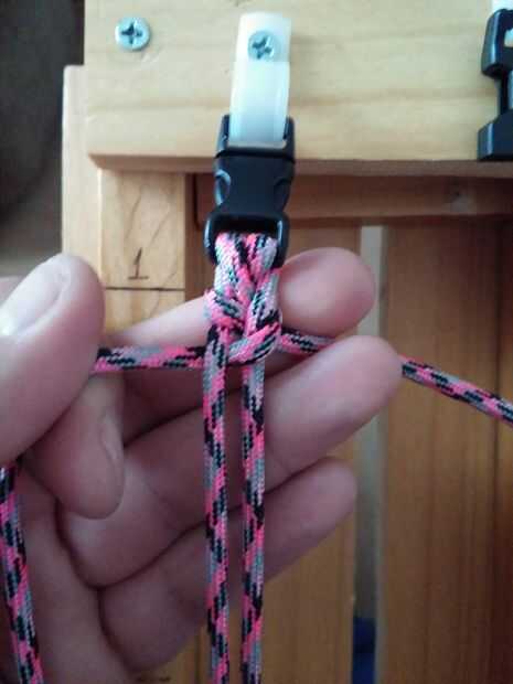 2) con la misma hebra traerlo entre las hebras de base otra vez, entonces hacia fuera a la derecha.