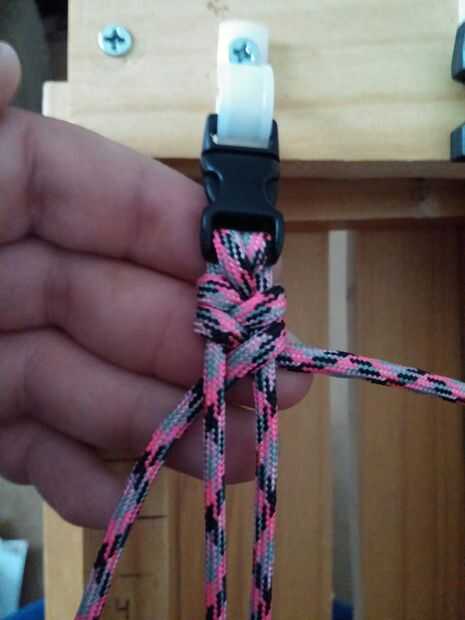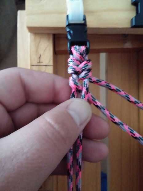 2) con la misma hebra traerlo entre las hebras de base otra vez, entonces hacia fuera a la derecha.