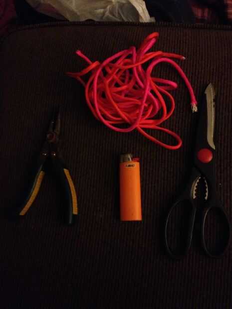 Todo lo que necesitas: 2 piezas de paracord de punta de mano 1 pieza de paracord la circunferencia de la muñeca de la nariz duplicaron luego algunas más para un nudo más otros dos o tres pulgadas más ligero de la medición de tijeras cinta Plyers