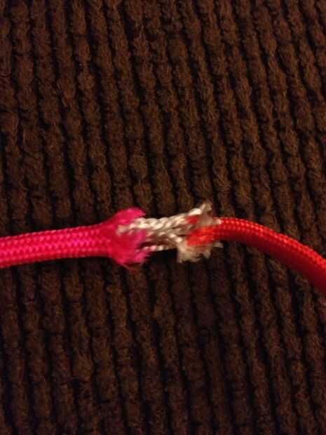 Una vez en el centro de la base de paracord necesita tomar el extremo de la cuerda y cortarlo corto después de tirar la mitad del molle a tomar la segunda y última pieza de paracord y tirar dentro un poco y ponerlos juntos y derretir con encendedor y utilizar plyers para realizar una transición suave