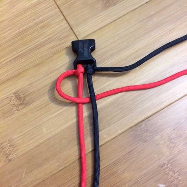 Fije el paracord a la hebilla y medir en la muñeca de tamaño. Si usted desea hacer un brazalete de paracord de 2 color, sólo se funden los extremos. Nota, esta trenza es más fácil de hacer en una plantilla de paracord.