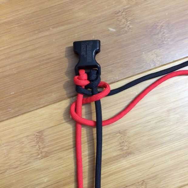 Con la segunda pieza de paracord, repasar, entre los pedazos de 2 centro de paracord, hasta alrededor de la pieza lejos y hacia atrás entre los pedazos de 2 centro de paracord. Tenga en cuenta que los extremos paracord deben terminar en el mismo lado cada vez.