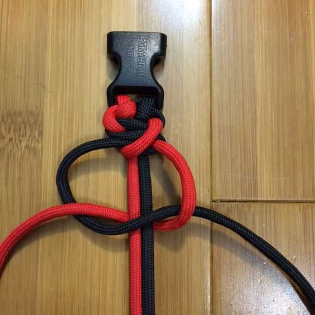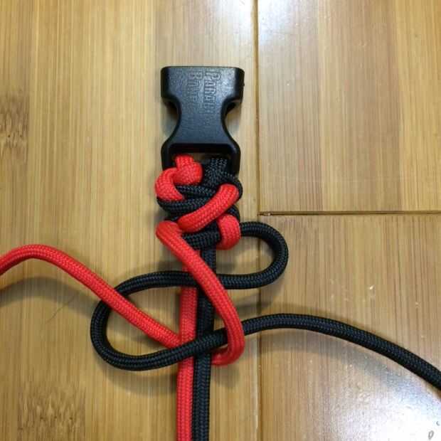 sale del mismo lado que pone en marcha. Luego tome la segunda pieza de paracord, traerlo diagnal a través del frente, llevarlo atrás y hacia arriba a través del lazo de la primera pieza de paracord.