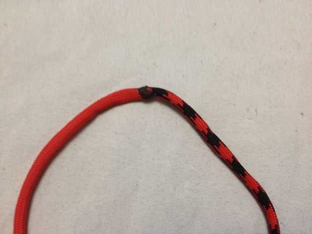 Las tijeras y el paracord y cortado 4 pies de cada color. Grabar uno de los extremos de ambas cuerdas. El otro extremo, tome los extremos que no quemaron y luz ambos y ambos se funden.
