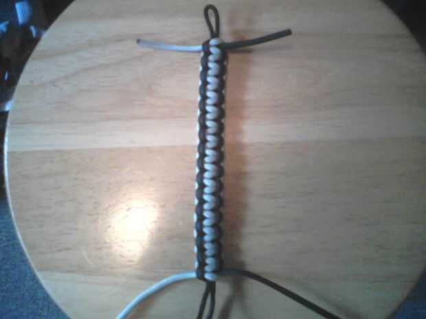 Continúe este método hasta que cada filamento tiene 16 lazos en un lado y ambos filamentos terminan en el mismo lado que comenzaron en (usando dos colores hace más fácil decir cuando esto se logra). En este este punto usted debe asegurarse de que sea suficientemente largo envolver alrededor de su muñeca. 16 es el número que ha trabajado para mí, y la pulsera se extenderá aunque usted muñeca es más grande, pero puede ser más cómodo para algunos intentar 18 loops.