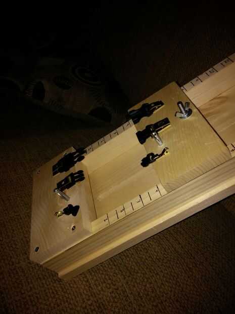 De la parte inferior de la placa base, parcela a varios lugares donde usted quiere poner tornillos. Asegúrese de que los tornillos se irán a través de la placa base y en parte en los rieles de guía. Asegúrese de perforar agujeros antes de poner los tornillos o usted puede astilla, o romper por la mitad, los rieles, así como romper la placa base. Para mi plantilla, pasó de dos a tres pulgadas de la parte superior e inferior y poner un tornillo en, luego espaciadas dos más entre los.