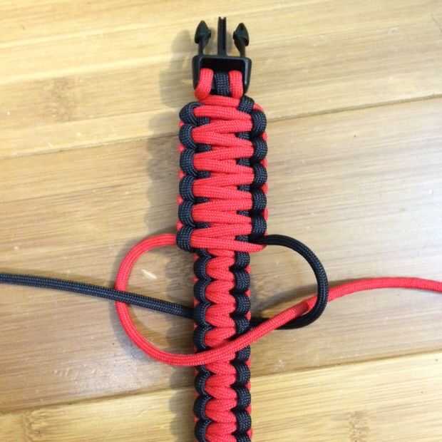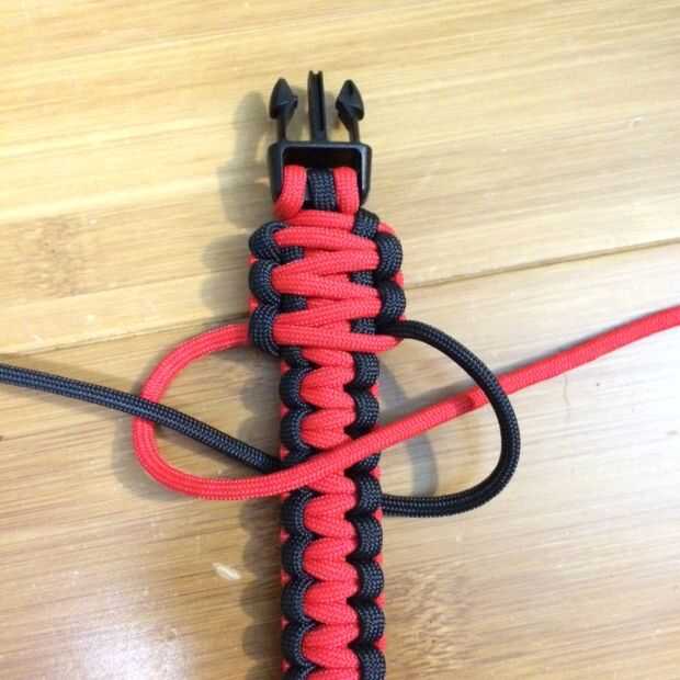 Continuar trenzando hasta llegar a la otra hebilla. Traer la primera pieza de paracord, llevar en el frente, luego tomar