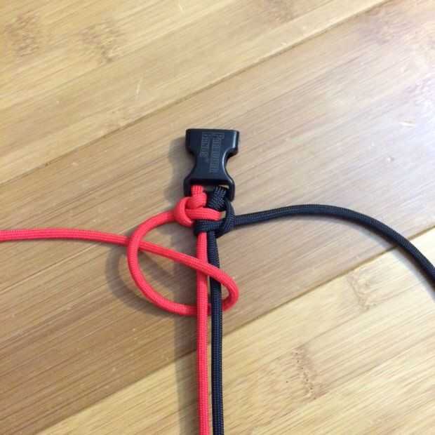 Otra vez con la primera pieza de paracord alrededor de ambas piezas de paracord, abrigo de debajo, luego por el agujero y tire firmemente.
