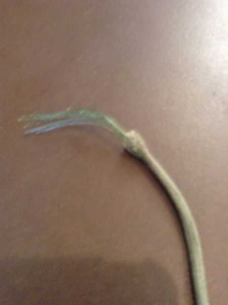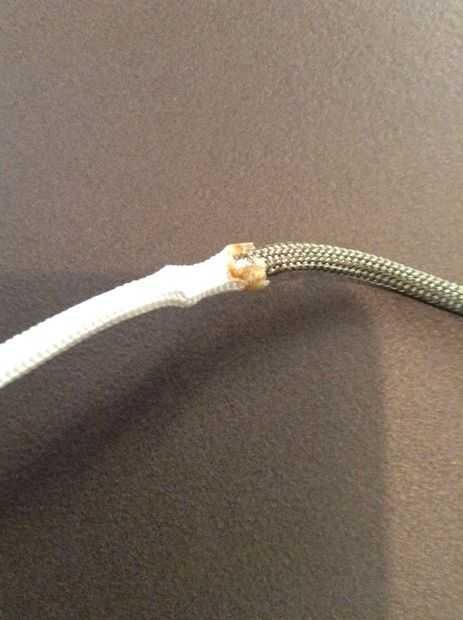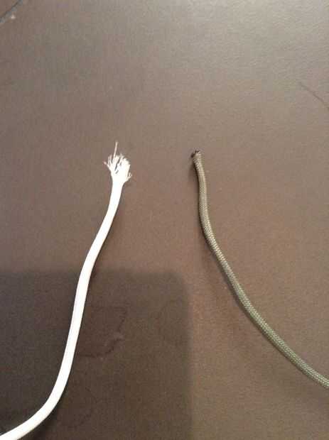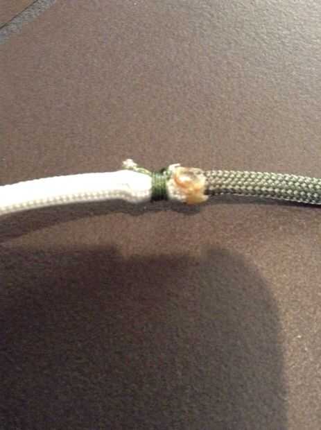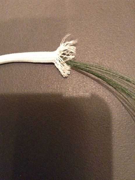 Corte 20 hebras de 9 pies de línea si usted está usando dos colores. 10 cuerdas de 17 pies si está usando uno. Darles de comer en la vaina de paracord. Si usted está usando dos colores quema uno de los colores extremos y fray el otro. Inserte el extremo quemado en otro y desde ese extremo. Usted puede también asegurar esto con un nudo.