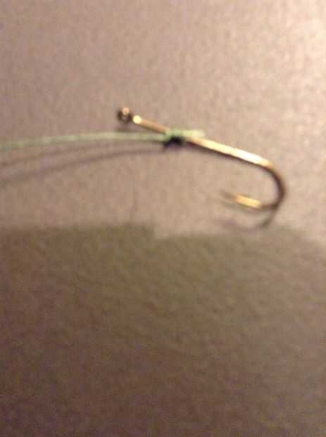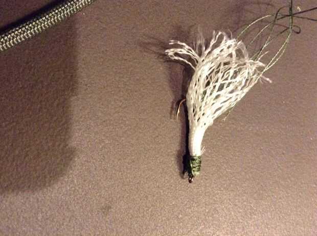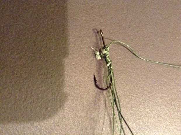 Corte un pedazo largo de la línea de pesca y 5 3 piezas. También corte un pedazo de 2 pulgadas de paracord. Fray el cable un poco. Enrolle el cordón largo en las piezas cortas y el gancho y enróllelo alrededor del paracord y un nudo para terminar.