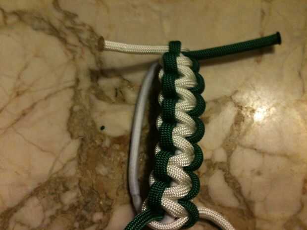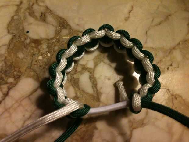 Ahora su libre hacer lo que tienes para cada cobra tejer brazalete de paracord. Si no sabes cómo hacerlo hay muchos instructibles en el sitio que son mucho mejores en explicarlo que soy. Empezar a tejer a lo largo del lazo del pelo hasta llegar al otro lado. Usted debe no atar los nudos muy apretados. Esto hará que el brazalete no estirar casi como mucho y no puede ponérselo.  Si te apetece la forma contraída de la pulsera es demasiado pequeña solo dar el lazo del pelo de un tirón y debe tener un poco más espacio para más nudos. Repetir este proceso hasta que usted siente como la forma contratada es sólo un poco pequeña para la muñeca. Usted quiere dar el elástico cierto margen en caso de que relaja un poco con el tiempo.