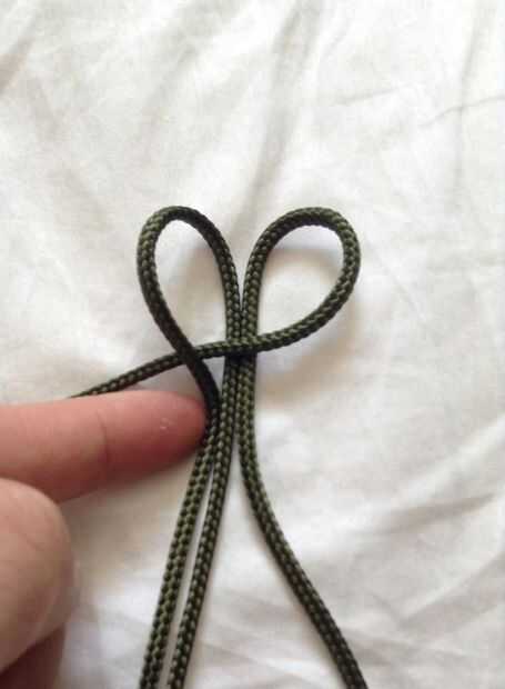 Ahora debe tener el paracord con un gancho en la cadena de derecha con el exceso que va delante la hebra izquierda paracord.