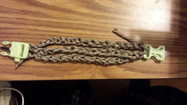 En lugar de la envoltura más elegante, este utiliza una trenza de deslizamiento antiguo que aprendí hace años en los Boy Scouts. Tardé menos de 5 minutos para hacer esta pulsera, y la pulsera 7" tiene cerca de 10 pies de paracord fácilmente accesible. Se desenvuelve rápidamente y puede ser vuelto a montar rápidamente. Parece que tarda aproximadamente (no exacto pero lo suficientemente cerca) 6" de paracord para hacer 1" de la trenza.