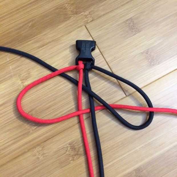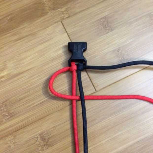 Con la primera pieza de paracord, el quiere ser el color principal. Traer a través de y entre los pedazos de 2 centro de paracord. Luego con la segunda pieza de paracord, envuelva alrededor de la cola de la primera pieza de paracord, luego entre los pedazos de centro de paracord y tire firmemente.