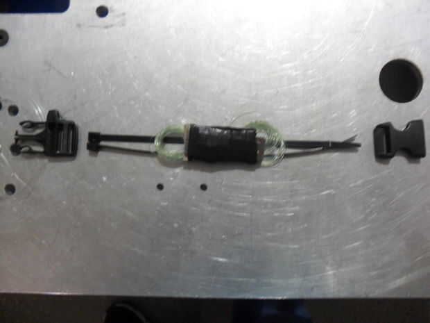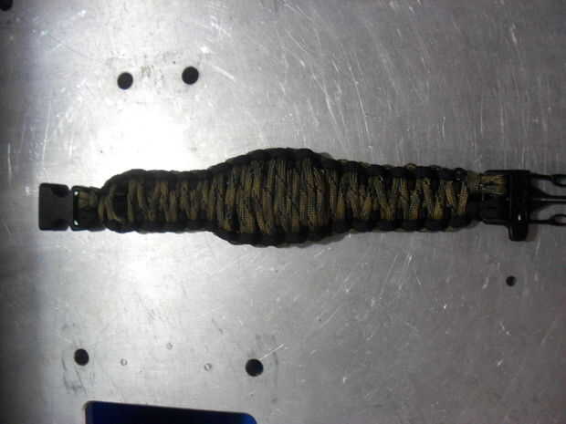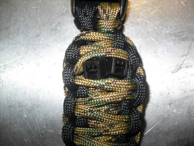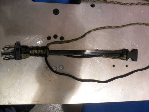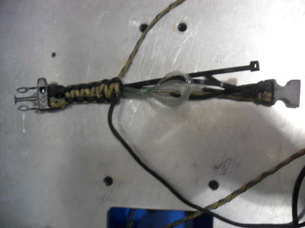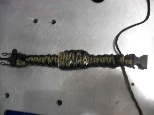 Lo primero que hice fue diseño todo para ver lo que sería el uso más eficiente del espacio. Apilan el abrelatas, anzuelo, kit de costura y hoja de afeitar encima de la otra y envuelto todo en cinta eléctrica para celebrar juntos. Luego até el paracord a la hebilla con el método de doble enganche. Personalmente creo que un doble enganche luce mucho mejor que un solo enganche. Entonces comencé hacer la cobra de la armadura, ata el zip lazos en la base de la pulsera. Cuando había recibido alrededor de un cuarto de la manera comenzó a tejer en el la línea de pesca y un poco más en tejió en el paquete de golosinas envueltas en cinta aislante. Luego hice un segundo paso para formar una armadura del rey cobra. Creo que esto lo hizo mucho mejor.
