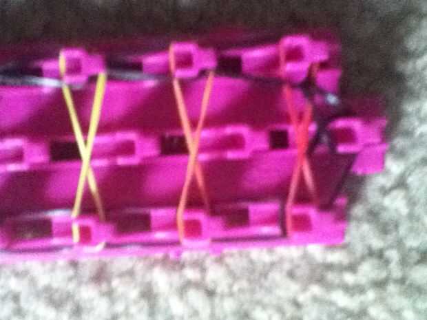 esta es una de las primeras pulseras que aprendí en mi telar. Cantidades pueden variar en diferentes telares.Paso 1: materiales You will need:Banda 26 de fuera20 bandas para escalera12 para la mediaSegún bandas de tamaño de muñecaTelarGanchoClipPaso
