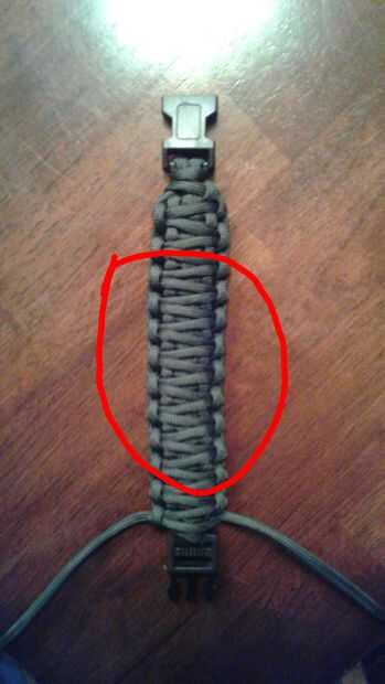 pulseras Paracord hacerlo con un Flatline o trazador (Flatline es un filamento de Paracord con la cadena de centro sacado y trenzado en la parte superior de un brazalete de Paracord y un trazador es un pedazo de micro paracord trenzado a lo largo de