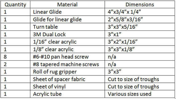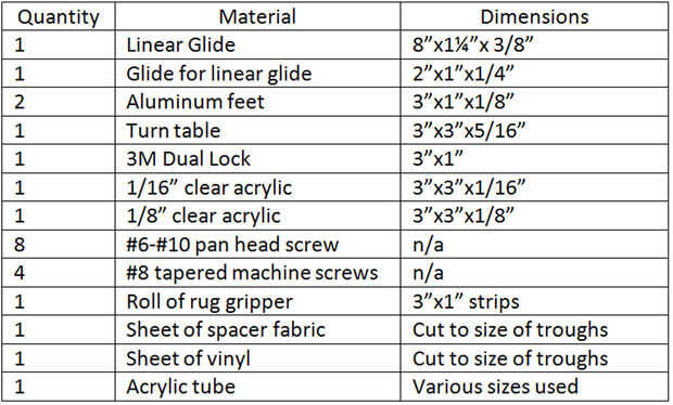 Reunir todos los materiales necesarios dependiendo de si están haciendo la versión pequeña o más grande. Usar las tablas que se muestra bajo su propia discreción como partes concretas pueden ser sustituidas. Mayoría de las partes puede encontrar en su ferretería local o tienda del arte. Sin embargo, el deslizamiento lineal y giratoria deben pedir de estos proveedores específicos: