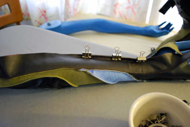 Me llevó a cabo la forma del brazo izquierdo y un montón de clips de oficina y recorta el cuero alrededor del brazo. Parecía bastante bueno! Algunas de las costuras eran un poco voluminosos, por lo que recortar algunos puntos, pero general era en gran forma. El plan era dejar el cuero en el brazo y deje que se extienda.
