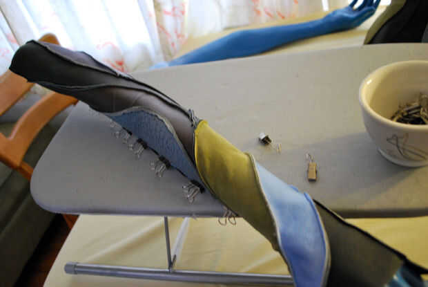 Pongo la forma de brazo en el torso del maniquí para ver cómo se veía. Por supuesto, los clips de oficina consiguieron de la manera. El brazo se ajusta bastante al cuerpo y los clips de axila mantuvieron hacer estallar. Reemplacé los 3 clips superiores con un alfiler y todo estaba bien.