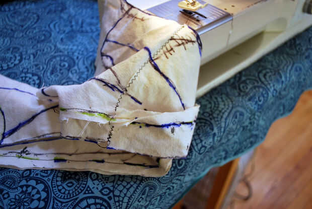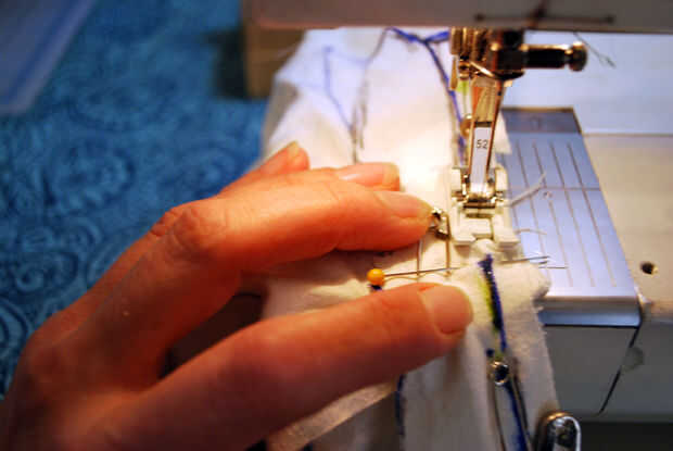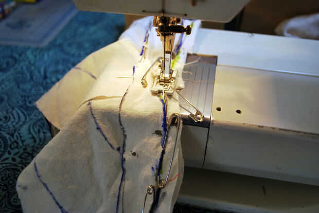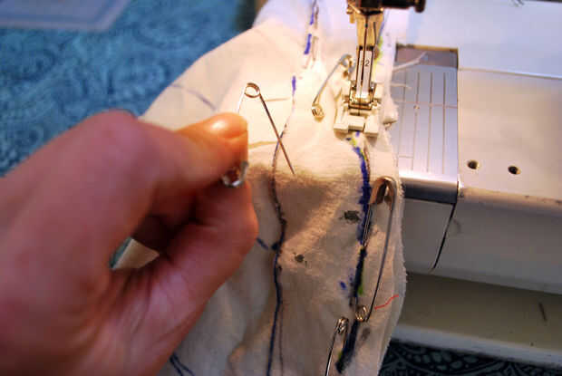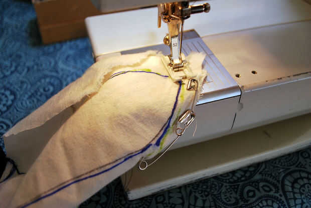 Tomé la maqueta de muselina a la máquina de coser y ajustar la máquina para una puntada recta bastante estándar para la costura bajo el brazo (0 anchura y a mitad de camino entre el 2 y 3 de la longitud de puntada). Comencé a coser en la parte inferior del brazo, pespunteado y había cosido mi camino hasta el margen de costura marcada. Tiré de cada pin del camino como cosí los pernos rectos acolchar y los pasadores de seguridad.