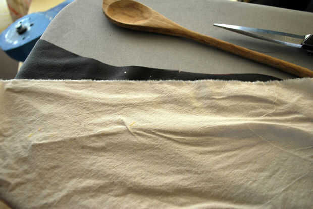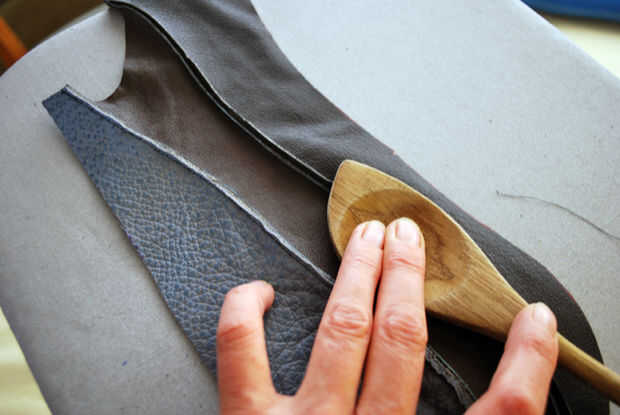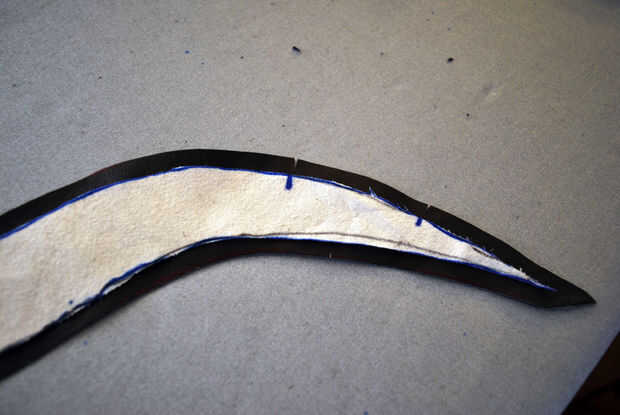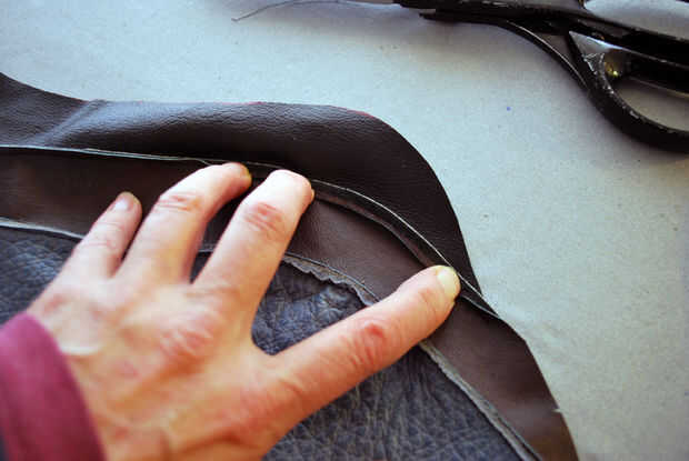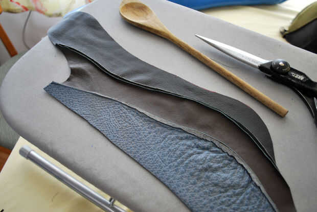 Corte piezas 1-4 de sus respectivos cueros, añadir un 1/4" todo el camino alrededor de cada pieza. En cada una de las marcas de la muesca que hice un pequeño recorte con las tijeras, lo suficiente como para marcar la ranura pero no lo suficiente para dejar huecos cuando cosieron las piezas. Cosieron las 3 primeras piezas en orden, utilizando una puntada recta y un margen de costura de 1/4". Después recorte los hilos de rosca, me recortan los márgenes hasta un escaso 1/8" y presiona open lo mejor que pude con mis uñas. He utilizado una cuchara de madera para alisar aún más, pero ellos no aplanar mucho.