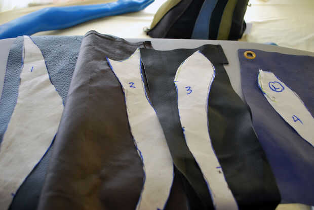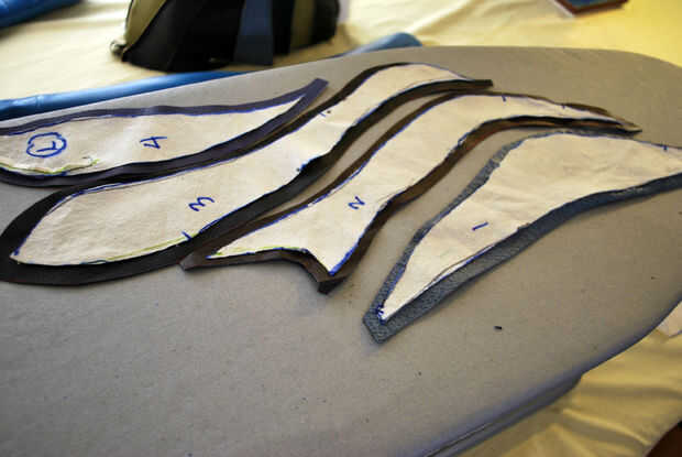 En orden, el cuero para las piezas del top 4 provino de una versión antigua de los Drivende espalda, 2 chaquetas de cuero de tienda de segunda mano y un pedazo sobrante de una muestra de tapicería me encargo teñido para una máscara Swiftwind.