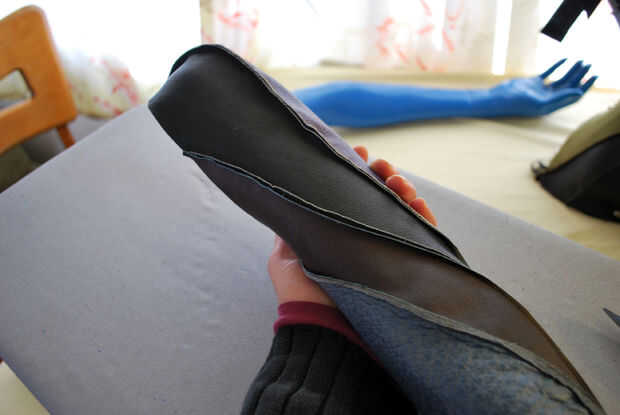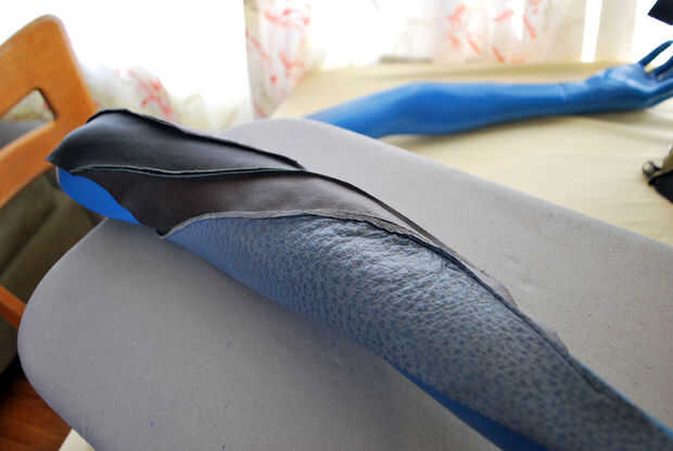 He cosido la cuarta pieza a los 3 primeros y recortar el margen de costura a un escaso 1/8". Después de abrir las costuras y alisar con una cuchara de madera, saqué mi forma de brazo para probar el ajuste de las piezas. La tapa de la manga curva suavemente sobre la parte superior y el codo parece encajar bien, pero era un poco demasiado pronto para decir. Necesitaba tener más piezas Unidos y tire de ellas todo el brazo antes de que realmente podía ver lo que estaba sucediendo.
