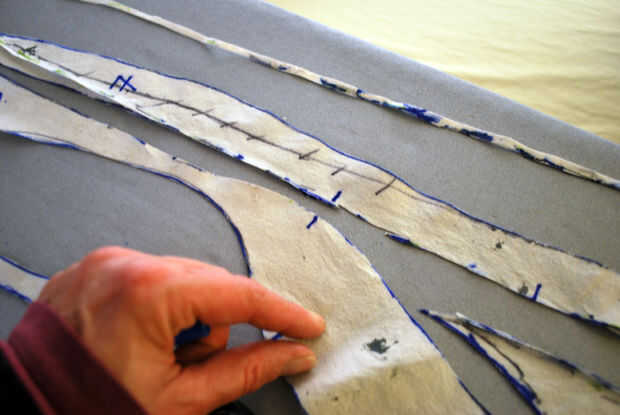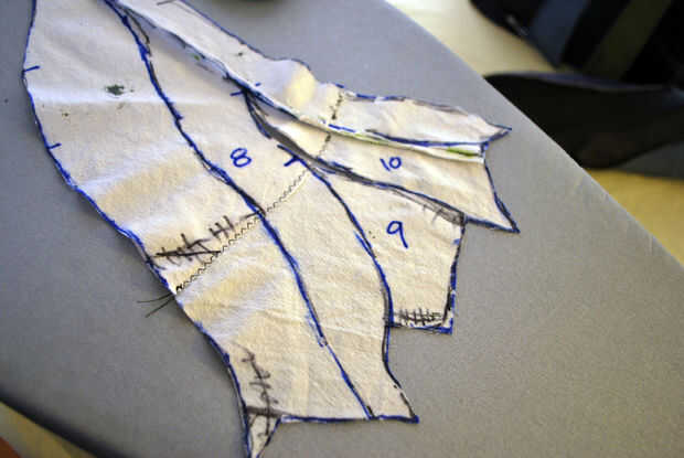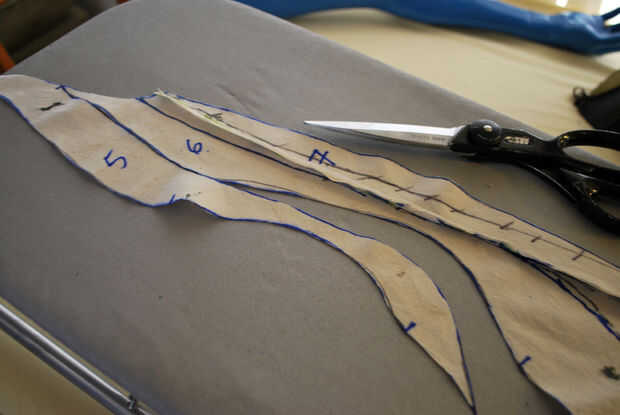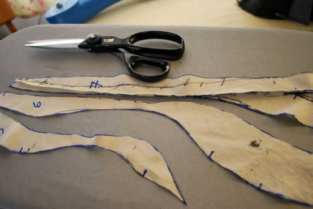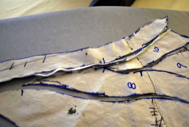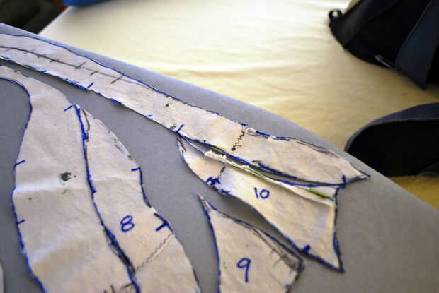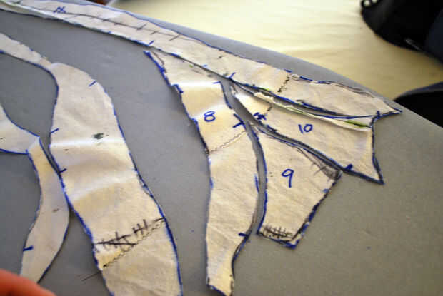 Las restantes piezas de la manga un poco es necesario trabajar antes de que pude cortar fuera del cuero. Las muescas en la pieza superior estaban todos en buena forma. Etiquetan las piezas de la muñeca como #8, 9 y 10 y cortar las piezas 5, 6 y 7. He recortado la costura debajo de las axilas hasta un escaso 1/4" y se deshizo de él donde pude.