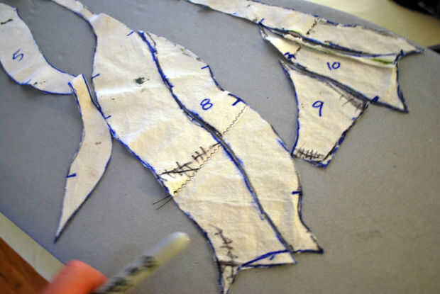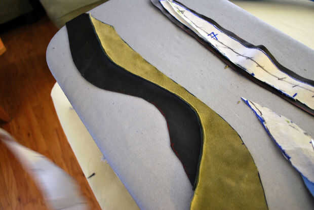 Pieza 5 era chatarra sobra rock & roll, 6 procedían de una chaqueta de gamuza chartreuse, #8 era chatarra de cuero tapizados, 9 utilizado que un par de pantalones, 10 más del rock & roll cuero y 7 chatarra de sofá. Había añadido 1/4 costura alrededor de cada pieza y cortar hacia fuera, luego puso las piezas en secuencia al lado de uno en la tabla de planchar. Me pareció la mejor manera de hacer un seguimiento de los.