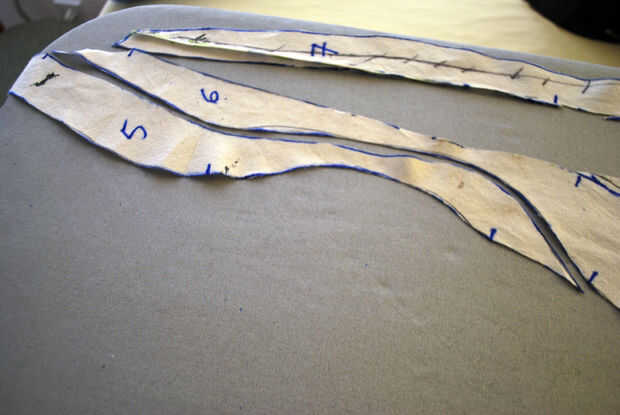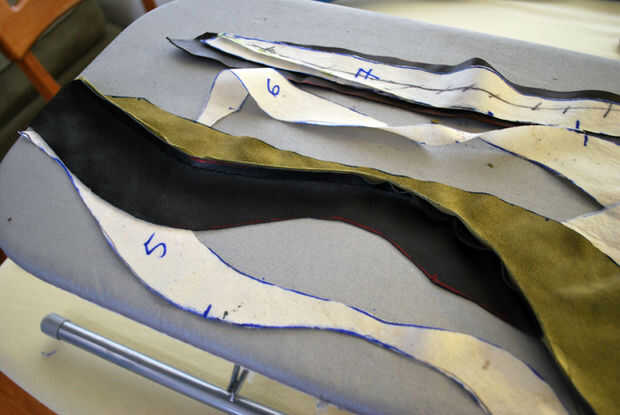 Cosí piezas 5 y 6 junto con una puntada recta, el margen de costura a un escaso 1/8 y el uña presiona abrir la costura. Puesto que la curva era un poco compleja probé las piezas cosidas contra la piel para asegurarse de que encajan todavía. Lo hicieron! Alisó la costura un poco más con mi cuchara de madera y nos dispusimos a pasar a la siguiente sección.