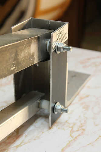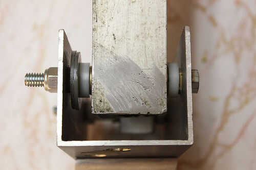 -Aluminio c-canal con bujes bronce insertados. El interior hueco tiene que ser el mismo ancho que la distancia entre la horquilla de acero. Mi espacio era 2".