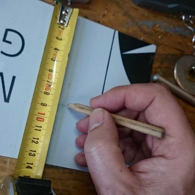 La longitud de mi placa es 17 cm (6 pulgadas). La anchura es más pequeña, así que marqué el centro de 17 cm y 8,5 cm de ancho. Aquí perforó un agujero de 6 mm.
