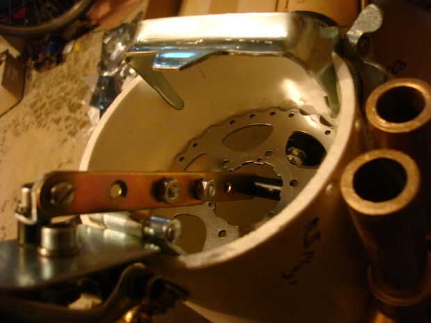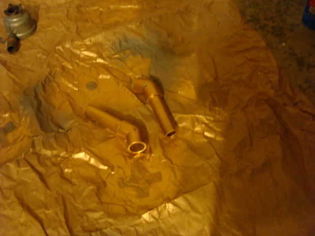 Después de mucho, mucho trasteo con los accesorios a lo largo del tubo principal, empecé a pintar los pequeños artículos hechos de plástico blanco feo, es decir, el sensor de flujo y las uniones de tubo pequeño en un color más agradable de latón. Aquí aprendí el valor de un clearcoat posterior: spraypaint metálico es, lamentablemente, muy propenso a saltar!