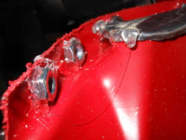 Sabía que tendría un rato duro con algunos de los pernos, ya que las tuercas se instalaría en eran casi totalmente inaccesibles con las dos mitades que se unen. Para tratar de frenar este problema de antemano, caliente pegué todas las tuercas sobre sus agujeros antes de llegar a trabajar. Esta estrategia se reunió con éxito mezclado, algunos sólo cayeron, otros funcionó a la perfección.