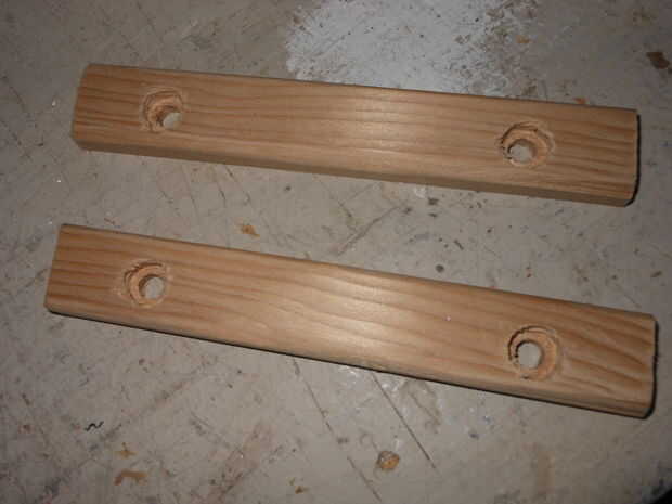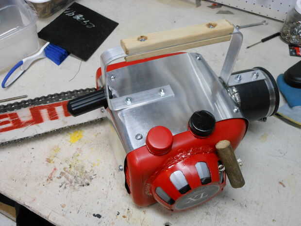 Luego perforé 6 agujeros en la manija, dos en la parte superior de la madera y cuatro en la parte inferior para su instalación en la motosierra. Tuve que perfore unos agujeros en la chapa y la goma en este punto también. Instalarlo fue un poco complicado, como los interiores de la sierra habían conseguido bastante completo, pero fue relativamente suavemente.