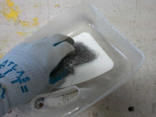 Sabía sería pintura la jarra, así que me tomé este tiempo para rayar hasta el interior y exterior con lana de acero, para obtener (con suerte) la pintura se agarre mejor. He tenido muy mala suerte en el pasado con spraypaint en plástico!