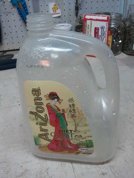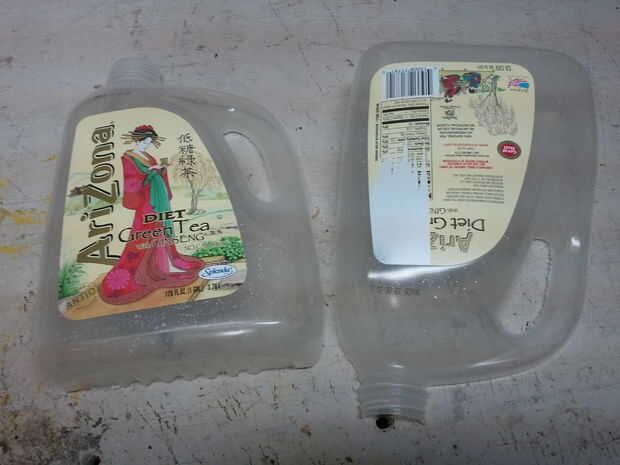 Busqué la tienda de comestibles para un recipiente que empareja mejor la forma de la Homelite XL. Lo que surgió fue un galón de Arizona iced tea... que resulta que no me gusta mucho. Después de regalar más de él y limpiando la botella, cuidadosamente me aserrado por la mitad y limpiar los bordes.