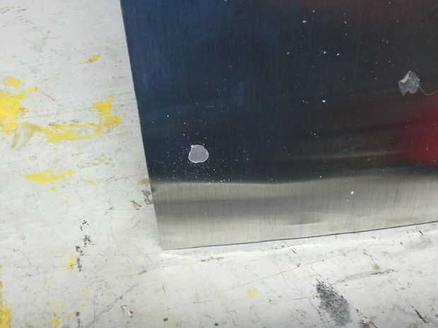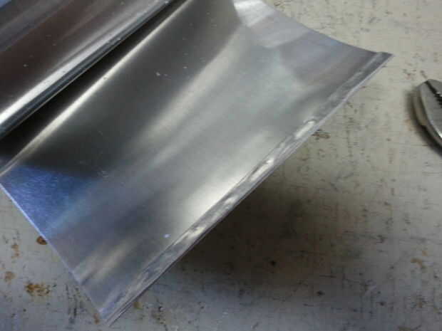 Quité el uno perno había instalado y cortar la chapa de un par de pulgadas más allá de la envoltura completa alrededor punto entonces doblado sobre ello para proteger contra bordes afilados. Usando un borde recto, había marcado un taladro correspondiente en el lado opuesto de la chapa, luego poner sobre un pedazo de chatarra madera y comenzó la perforación de agujeros.