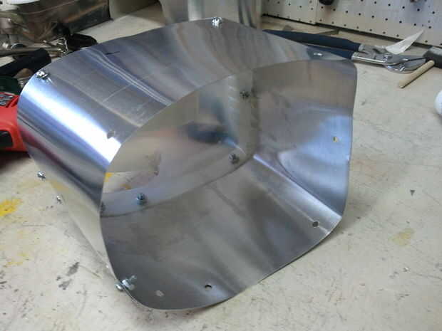 Una vez que había ido todo el camino alrededor, el par de pulgadas de la superposición de la chapa metálica entró en el juego. He quitado esa primera tuerca y el perno y perforó un agujero a través de la superposición, por lo que el primer perno iría dos veces a través del metal de hoja.