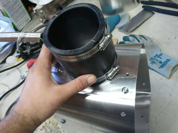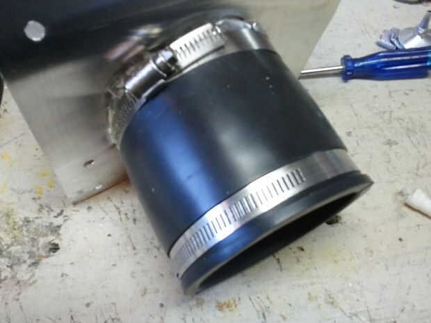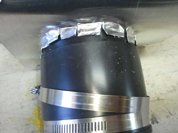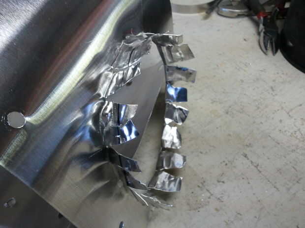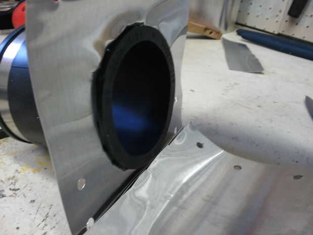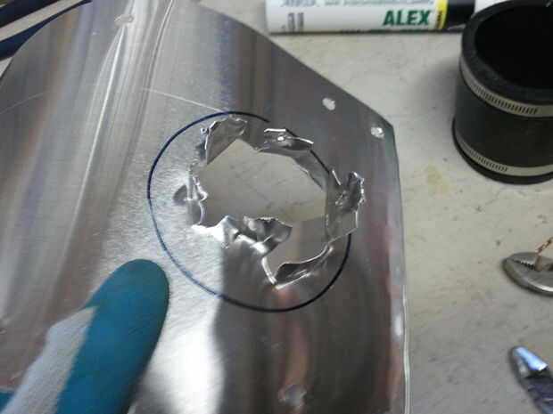 Una vez el agujero del tamaño correcto, recortan detrás los bordes irregulares del metal de hoja a la mitad una pulgada larga. He aflojado la abrazadera en un lado y se deslizó la grifería en el orificio. La abrazadera se deslizó hacia atrás en los bordes sueltos del metal de hoja y reforzada. Esto proporcionó un brazalete muy robusto!