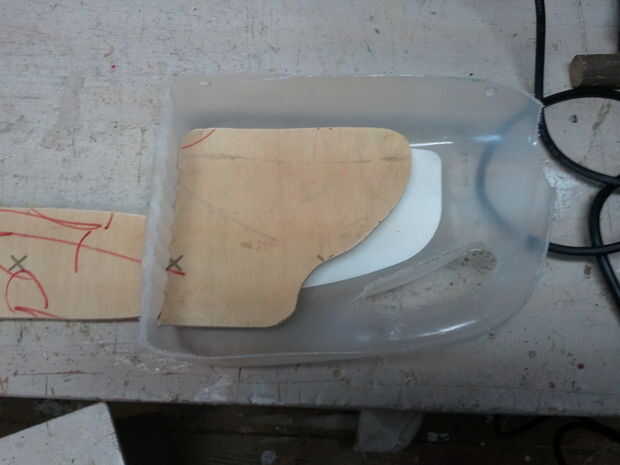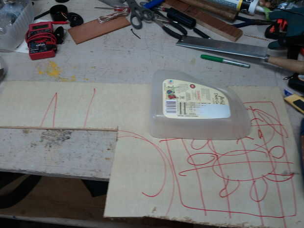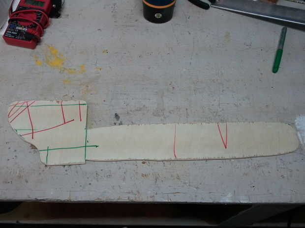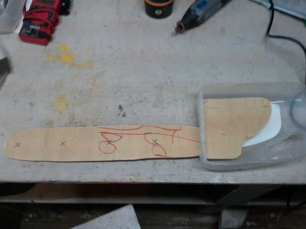 Mi diseño mental para la barra de motosierra implicó un núcleo interno de la madera contrachapada que alcanzó dentro del cuerpo de la motosierra, para ser utilizado como el principal apoyo para la manija. El primer paso en la construcción de esto sería cortar madera contrachapada en el tamaño y forma correctos.