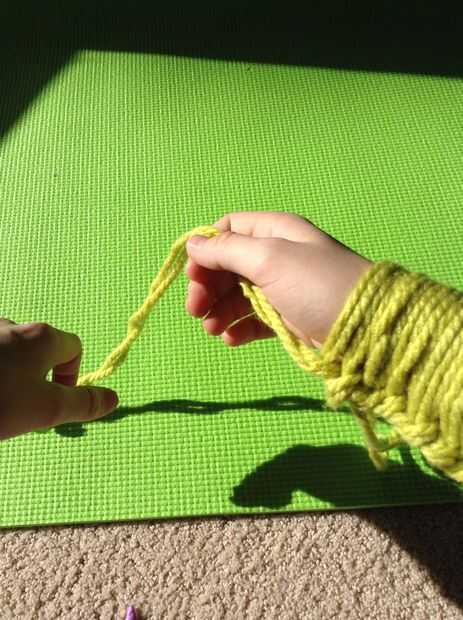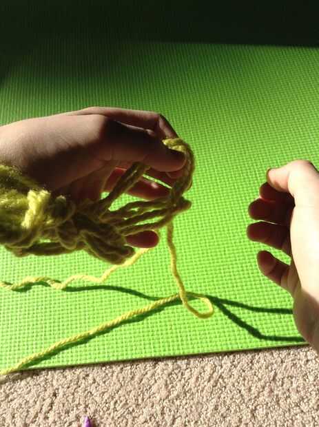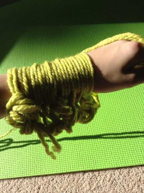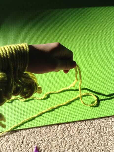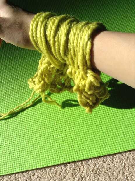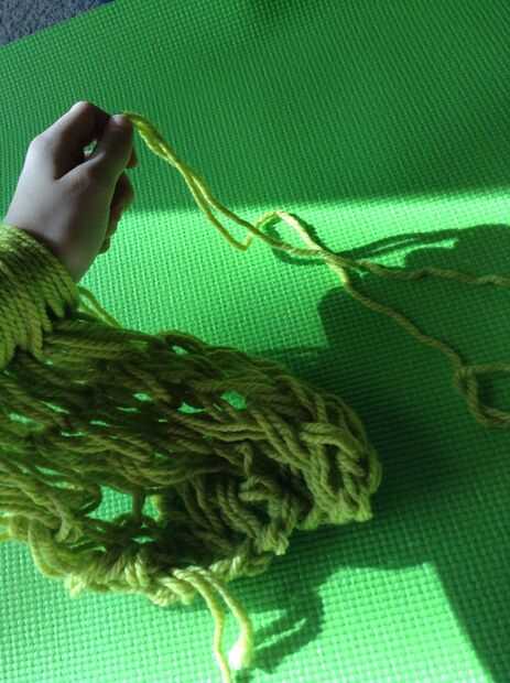 Con su mano derecha agarra el hilo de trabajo y deslice la puntada más cercano a tu mano tu mano y jale el hilo de trabajo haciendo un bucle. Deslice la otra muñeca a través del lazo. Nuevo con todas sus puntadas incluyendo el nudo deslizante (que es el mismo método que el resto de los puntos de sutura) hacer esto hasta que todos sus puntos han sido transferidos a su izquierda (o derecha si tu mano dominante es la izquierda) mano.