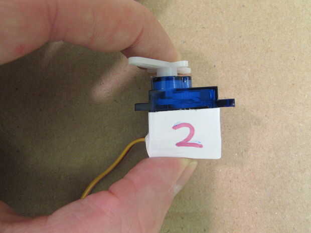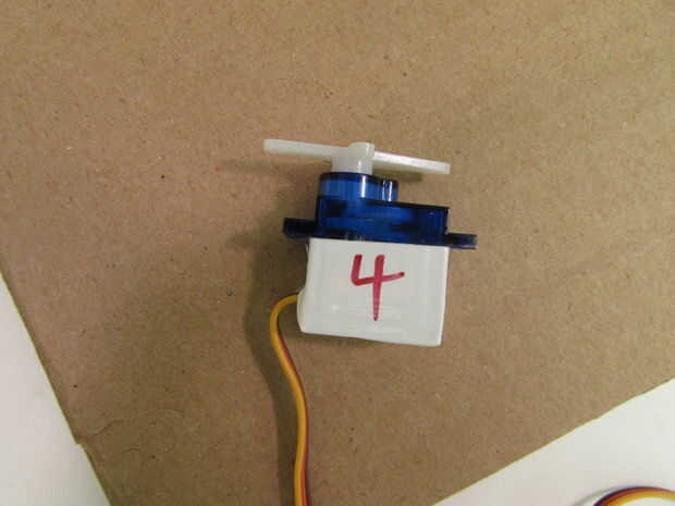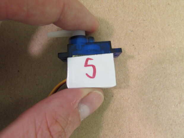 Mi dibujo es un poco difícil de leer si no ya sabes lo que estoy haciendo, así que he incluido fotos de los cinco de mi servos y los extremos de su rango de movimiento. Cada conjunto de imagen muestra el brazo girado totalmente en sentido antihorario, totalmente a la derecha y luego una foto de la cara con una etiqueta para que servo es. No tienes que conseguir tus servos para parecerse exactamente a esto, pero usted debe obtener cerca y no olvides etiquetar todos tus servos con sharpie para usted llevar el control de los!